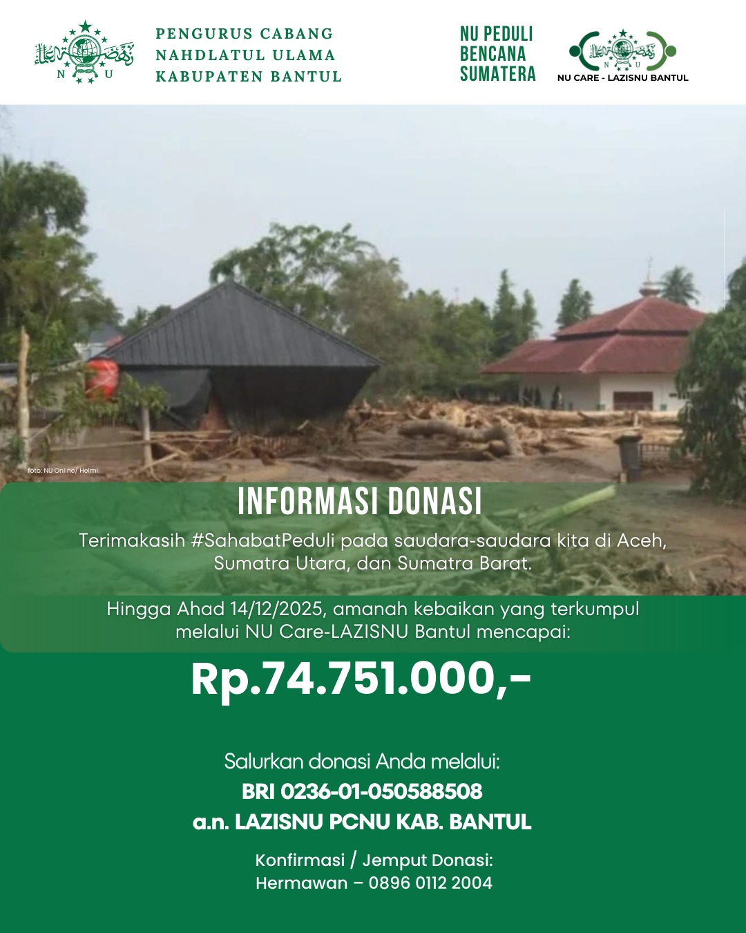 LAZISNU Kabupaten Bantul melalui program NU Care Peduli Bencana Sumatera terus menggalang donasi untuk membantu para korban banjir di Aceh, Sumatera Utara, dan Sumatera Barat. Hingga Ahad, 14 Desember 2025, total dana kemanusiaan yang berhasil dihimpun mencapai Rp74.751.000.