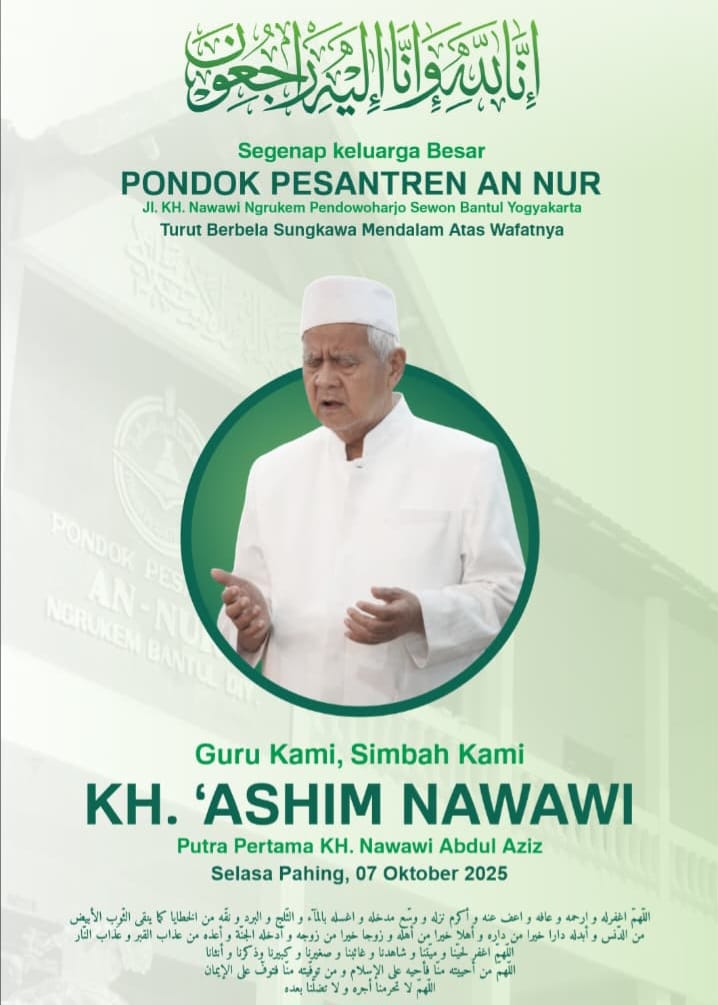 Kabar duka menyelimuti keluarga besar Pondok Pesantren An Nur Ngrukem Yogyakarta. Salah satu tokoh penting sekaligus dewan pengasuh pesantren, KH. Ashim Nawawi, berpulang ke rahmatullah pada Selasa Pahing, 7 Oktober 2025, pukul 08.25 WIB, di RSUP Dr. Sardjito Yogyakarta.
