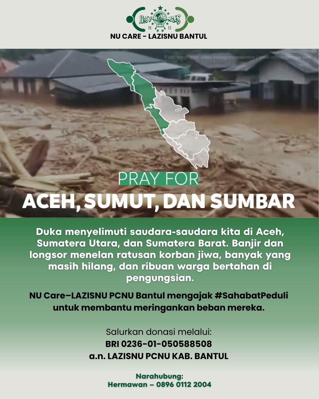 “Saudara-saudara kita di Aceh, Sumut, dan Sumbar sedang menghadapi cobaan berat. Banyak yang kehilangan keluarga, rumah, dan harta benda. Sudah seharusnya kita hadir untuk membantu mereka bangkit kembali. Kami mengajak masyarakat Bantul dan para dermawan di mana pun berada untuk ikut serta dalam gerakan solidaritas ini,” ujar H. Choiron Marzuki dalam pernyataannya.