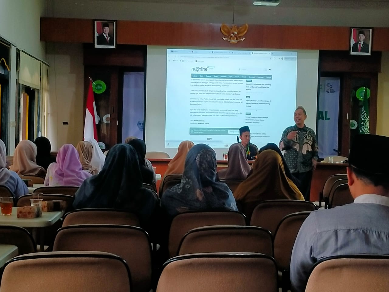 Suasana workshop berlangsung hangat dan interaktif. Para peserta antusias mengikuti materi, dan berdiskusi cara menulis berita serta puisi. Layar proyektor di depan ruangan menampilkan contoh berita dari NU Online sebagai bahan pembelajaran.