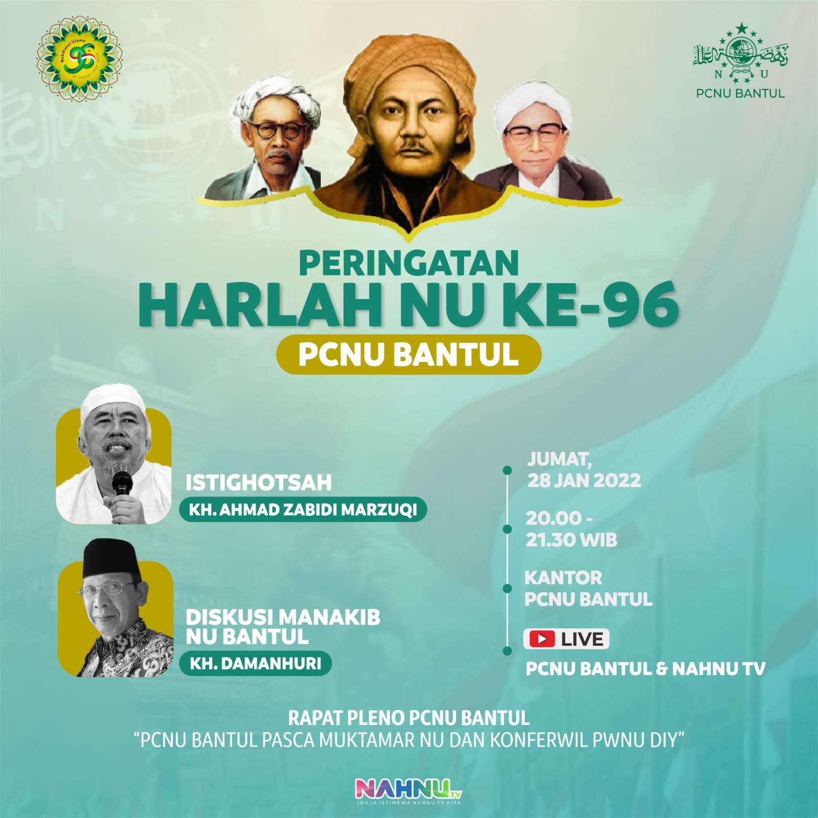 Pengurus Cabang Nahdlatul Ulama Kabupaten Bantul menggelar Istigotsah dalam rangka memperingati Harlah NU ke 96 malam ini, Jumat (28/01/2022). Kegiatan ini dilaksanakan secara hybrid dan dipusatkan di Aula PCNU Bantul yang dilanjutkan dengan diskusi manakib NU Bantul serta Rapat Pleno PCNU Bantul.