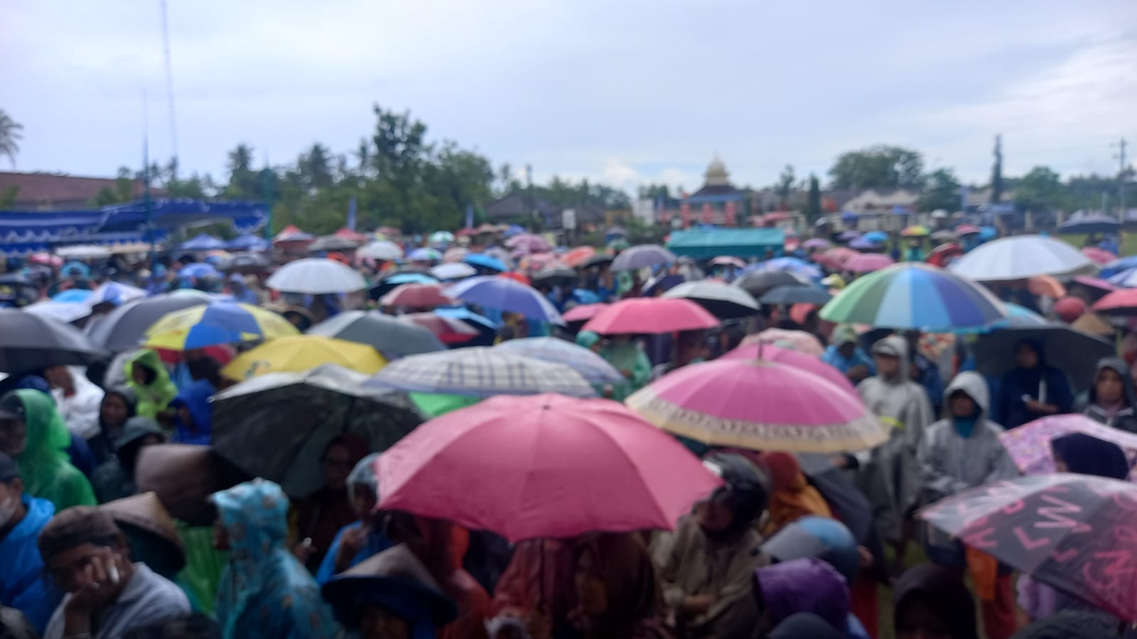 Meski diguyur hujan ringan, ribuan warga tetap antusias mengikuti kegiatan ini. Sekitar 1.000 peserta memadati lapangan sejak pagi hari dengan membawa payung dan jas hujan, menciptakan pemandangan penuh warna yang menambah semarak acara.