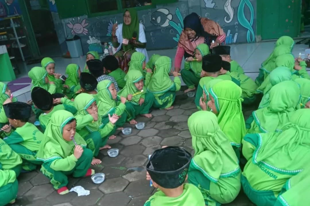Keceriaan tampak di wajah ratusan anak RA Masyithoh Karanganom, Wonokromo, Pleret, Bantul, pada Jumat (7/11/2025). Sebanyak 207 siswa antusias mengikuti Pelatihan Gosok Gigi yang diselenggarakan oleh Bidang Kesehatan Pimpinan Cabang (PC) Muslimat NU Kabupaten Bantul.