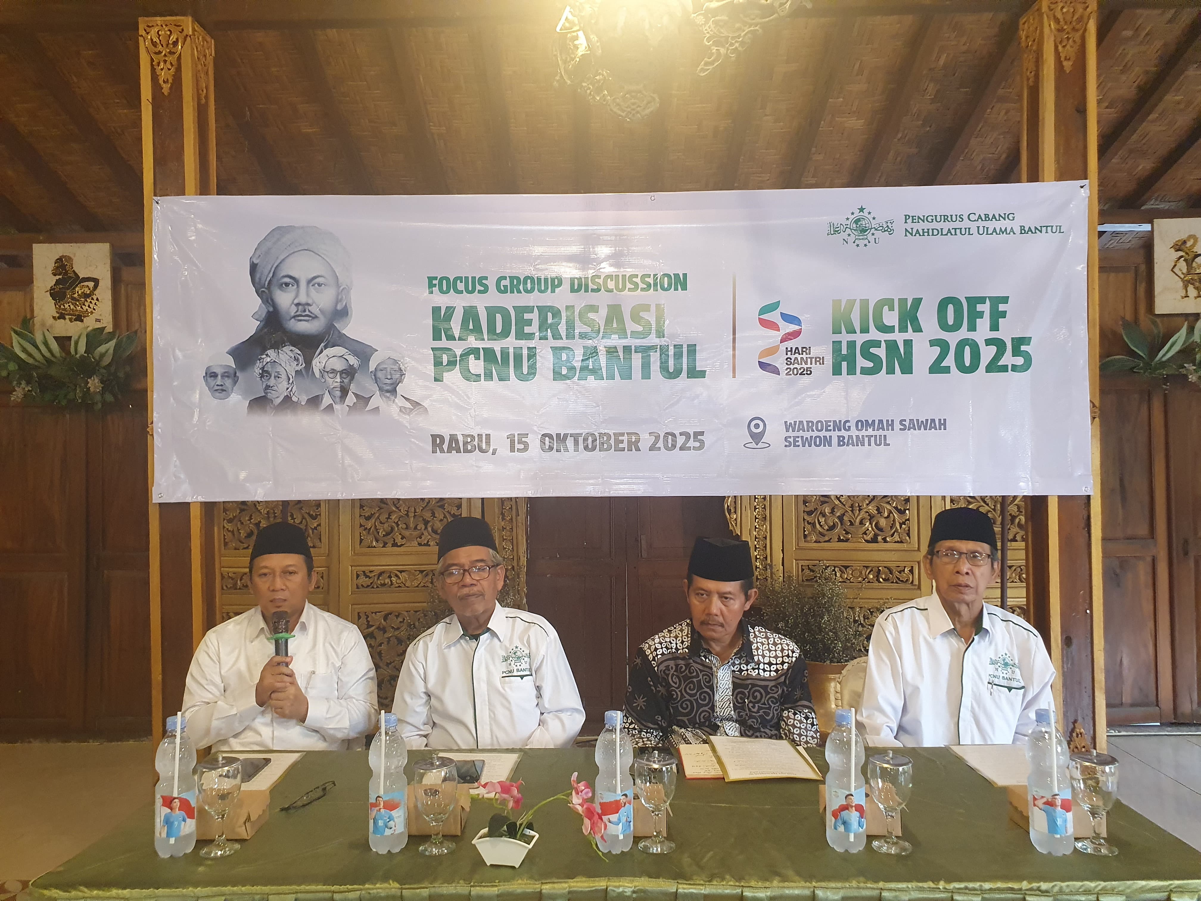 Pengurus Cabang Nahdlatul Ulama bersama seluruh Badan Otonom NU Kabupaten Bantul secara resmi memulai gelaran peringatan Hari Santri Nasional 2025, Rabu (15/10/2025). Kick Off HSN Kabupaten Bantul 2025 ditandai dengan pemukulan gong oleh Katib Syuriah PBNU, DR. KH. Hilmy Muhammad, MA bersama KH. Habib Abd Syakur, Wakil Rois PWNU DIY, KH. Damanhuri, Rois Syuriah dan Prof. DR. H. Riyanta, M.Hum dan Ketua Banom NU.