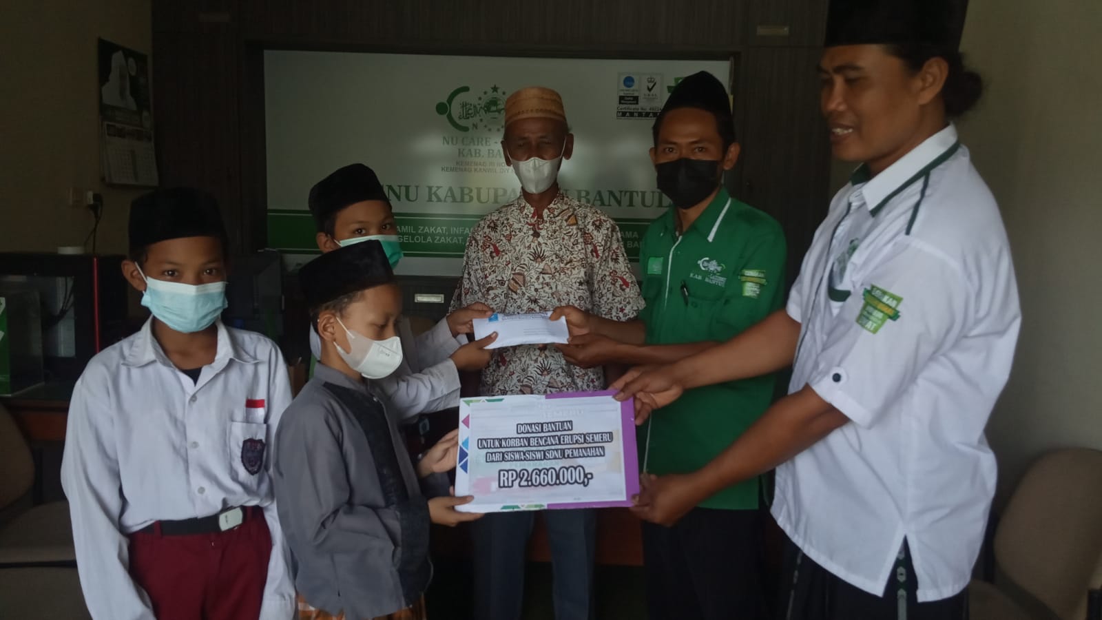 Sekolah Dasar Nahdlatul Ulama Pemanahan Pleret menyerahkan bantuan donasi bagi korban erupsi Gunung Semeru melalui Lazisnu PCNU Bantul, Senin (13/12/2021). Bertempat di Kantor Lazisnu, bantun diserahkan langsung oleh perwakilan siswa dan diterima oleh pengurus Lazisnu PCNU Bantul.