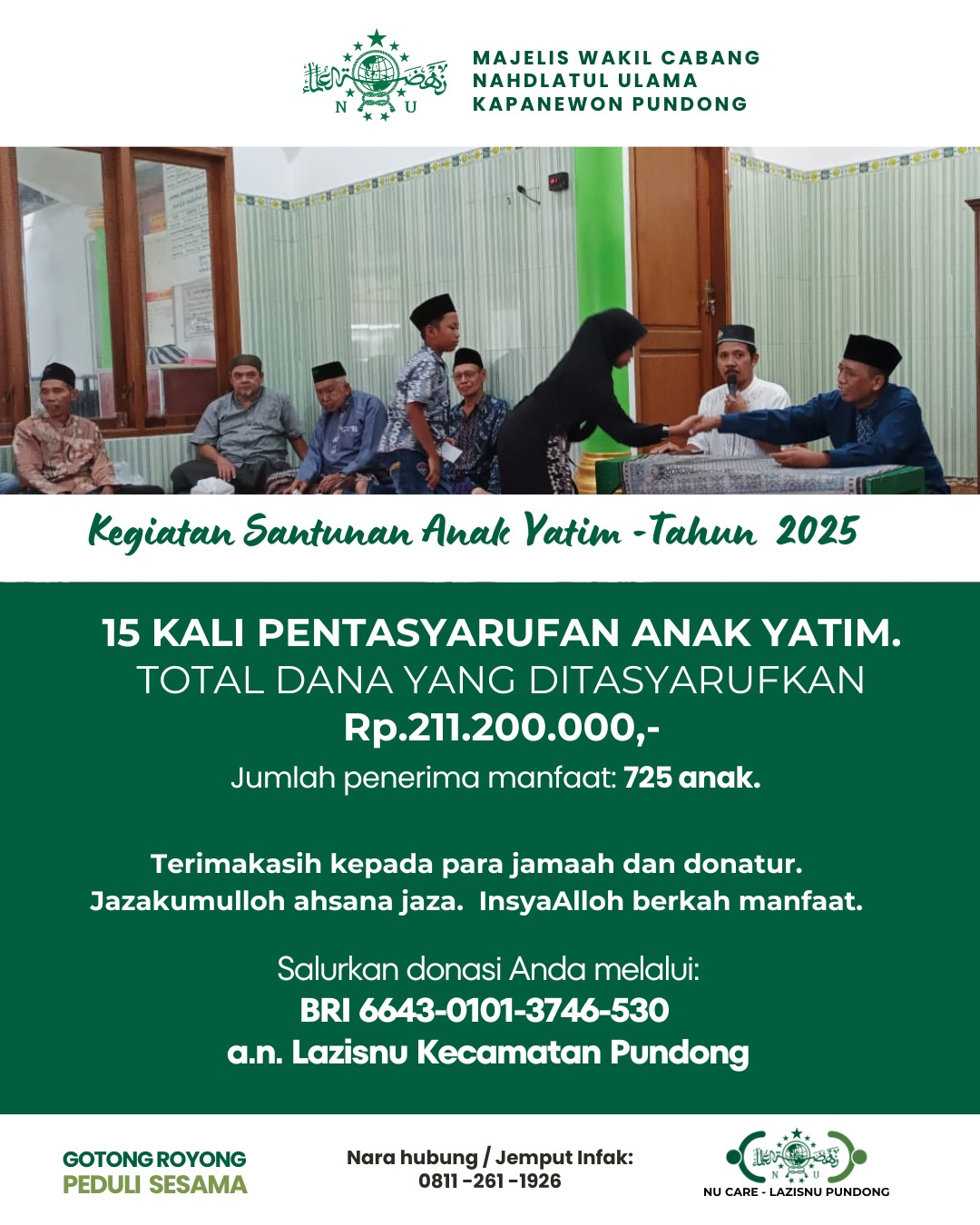 UPZISNU PUNDONG SALURKAN SANTUNAN ANAK YATIM RP. 211,2 JUTA SEPANJANG 2025